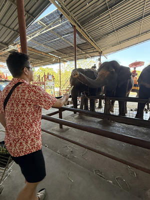 象にたんまりおやつをあげて、すっかり手名付けた社長
